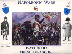 Oben: Die 4 verschiedenen Figuren der Packung. (Die Figur unten links ist auch von der Rückseite abgebildet). Die Dragoner tragen die kurze Habit Veste 1812/1815