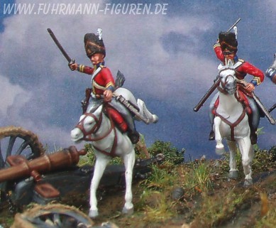 Verwendete Bausätze von Esci, Nr. 217 und von Italeri, Nr. 6001 "Scots Greys", mit sehr umfangreichen Umbauten der Pferde.Die Köpfe mit der Bärenfellmütze entstammen dem Hat Bausatz Nr. 8170 French Guard Chasseurs.Malmedium: Ölfarbe