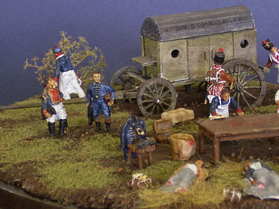 Umsetzung des französischen Ambulanz-Sets von Art-Miniaturen (JS 72/0167), entstanden auf dem Dioramenworkshop am 26./27.06.04. Neben diversen Streumaterialien wurde unter anderem ein alter Teebeutel (!!!!) verarbeitet. Insgesamt eine sehr schöne Figurengruppe die in sich abgerundet ist. |